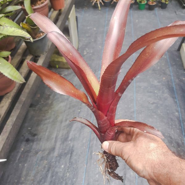 Bromélia epífita, de cor vibrante, Aprecia substrato de boa drenagem. devido ao seu formato verticalizado e sua cor, combina bem em arranjos pendurados.