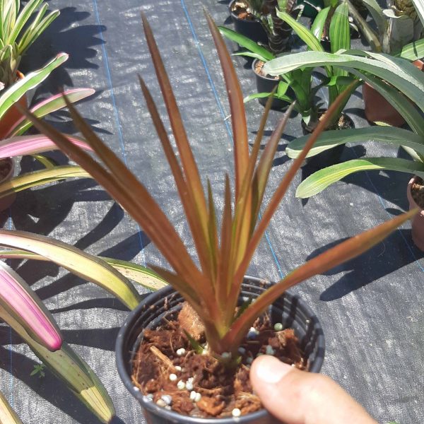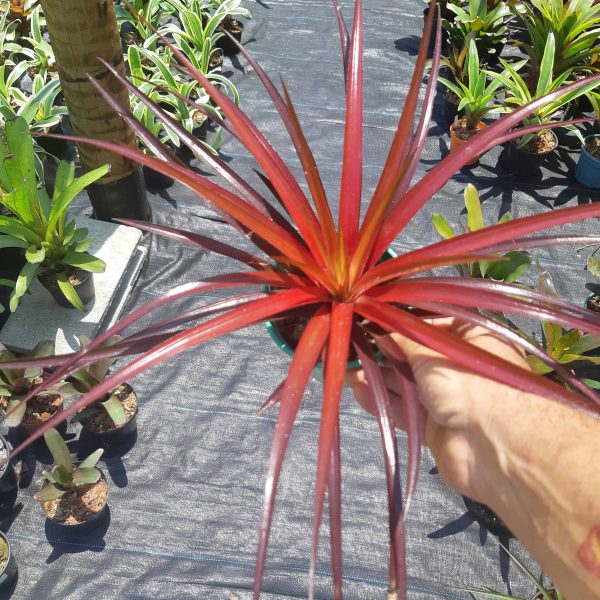 Bromélia híbrida de Sincoraea navioides com Neoregelia Fireball. Na luz correta, adquiri um vermelho intenso nas folhas que a torna bastante ornamental. Pós floração, emite vários brotos laterais.